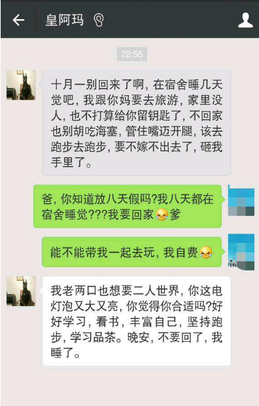 爸爸:十月一别回来了啊,在宿舍睡几天觉吧,我跟你妈要去旅游,家里没人,也不打算给你留钥匙了,不回家也别胡吃海塞,管住嘴迈开腿,该去跑步去跑步,要不嫁不出去了,砸我手里了。